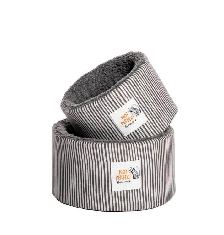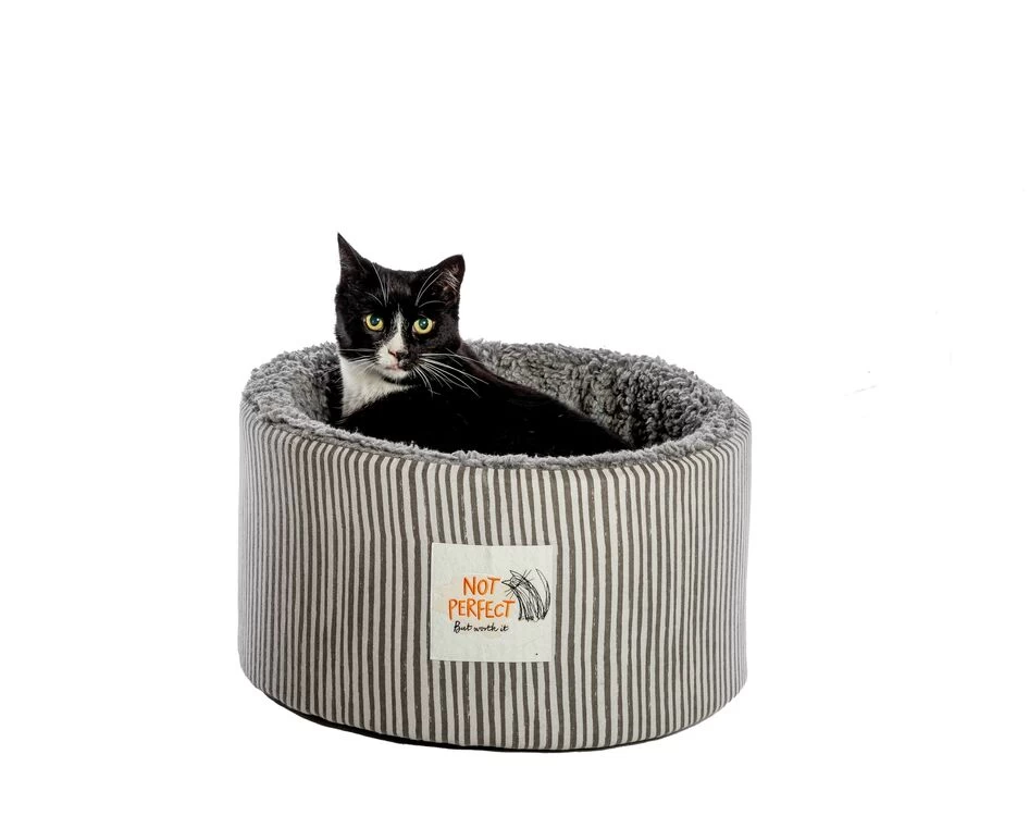This Battersea Snuggly Stripes Cat Cosy Bed will be a warm and comfortable sanctuary for your pet, with a soft brushed cotton exterior and a Sherpa fleece lining that has been made from 100% recycled fibres.