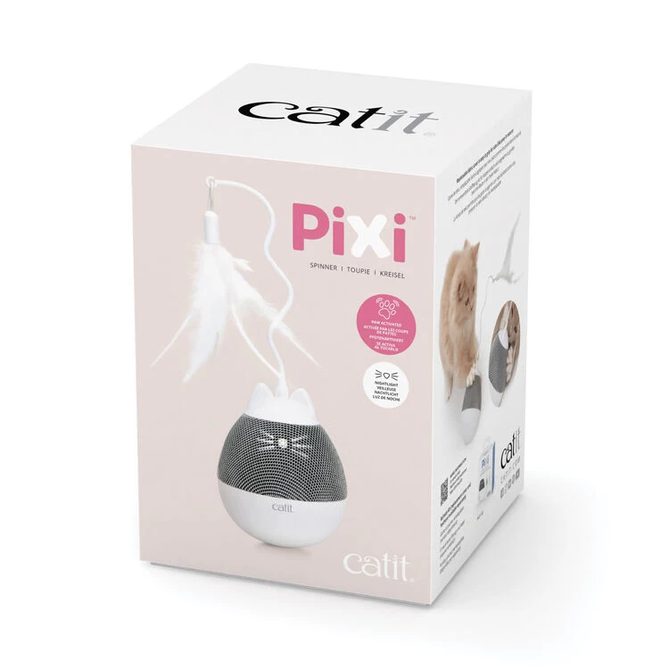 Paw-activated whirlwind of feathery fun! At your cat’s touch, the Catit PIXI Spinner will start to spin, dispensing treats to reward play. The toy’s fabric cover is easy to grip for cats, and the cute cat features light up when activated, which is great for nightly play sessions. The toy takes 3x AAA batteries (not included). The The Catit PIXI Spinner is equipped with a unique fabric cover.