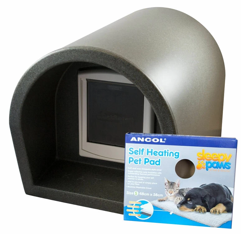 - Kennel, Door & Pet Pad: The KatDen Cat Kennel, a 2-way Petsafe pet door and a fleecy self-heating pet pad