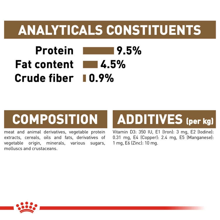 Ingredients: Meat and animal derivatives, vegetable protein extracts, cereals, oils and fats, derivatives of vegetable origin, minerals, various sugars, molluscs and crustaceans.
