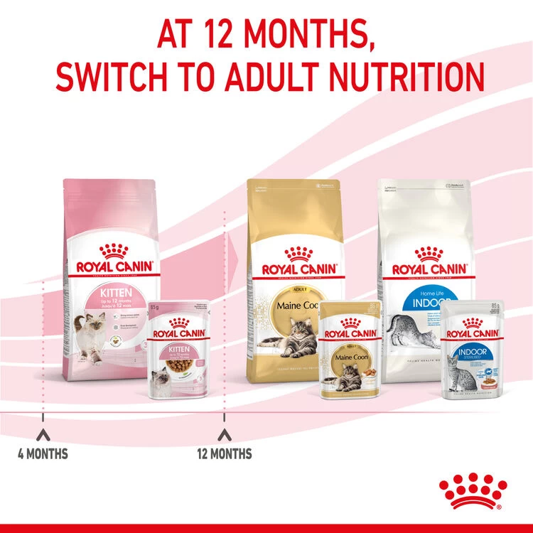 Did you know that a kitten’s nutritional needs change as they grow? By the time your kitten reaches 12 months old, they will need a diet that’s specially adapted to meet their nutritional needs as a grown cat. At this stage, you can transition them onto the ROYAL CANIN® range of diets for adult cats, available as dry kibble or wet food in loaf, gravy or jelly.